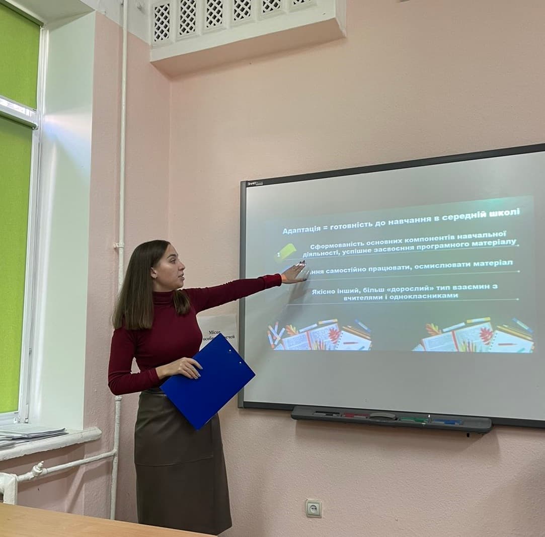28.10.2021Успішність переходу від молодшої до середньої школи забезпечується врахуванням наступності й перспективності в розвитку дітей на цих суміжних освітніх ланках. Усвідомлюючи вищезгаданий факт, 25 жовтня 2021 року вчителі-предметники та вчителі початкової школи детально обговорили педагогічно-психологічні кроки для збереження комфорту дітей та їх успішної адаптації у 5 класі, класні керівники (Толстік К.О. – 5А, Вітковська Л.В. – 5-Б, Шевченко В.М. – 5-В, Башилов І.О. – 5-Г) емоційно презентували колективи своїх вихованців.