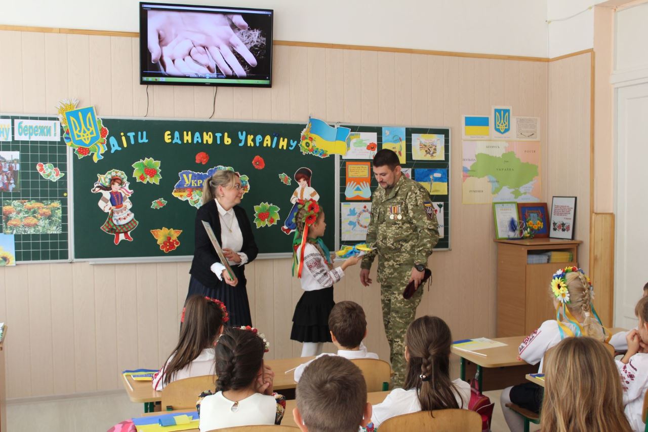 12.10.2018Напередодні Дня українського козацтва та Дня захисника Вітчизни у 4-А класі (класний керівник Дюденко В. В.) відбулося неймовірне патріотичне шоу «Діти єднають Україну». Піднесені зверненням гостя, старшого сержанта 199-ого навчального Центра десантно-штурмових військ, бійця АТО, волонтера, Орлова Сергія Даніїловича, учні співали, декламували вірші, читали молитву, вшанували свічкою пам’яті тих, хто загинув, виборюючи цілісність України. Лідер 4-А класу Лошицька М. попросила Сергія Даніїловича від імені учнів усієї школи привітати бійців АТО та передати їм листівки, виготовлені 5-7 класами. Дюденко В. В. провела церемонію прийняття у школу 173 ще одного члена – Орлова С. Д., прикріпивши йому значок-символ. З повагою учні школи слухали слова директора Мазаєвої Л. А., яка подякувала героєві за мирне небо у рідному краєві.