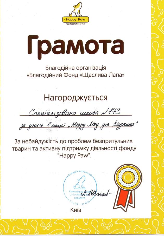 Учні спеціалізованої школи № 173 стали учасниками Всеукраїнської благодійної акції "Happy Мяу для Мурчика", ініційованої благодійним фондом "Щаслива лапа".