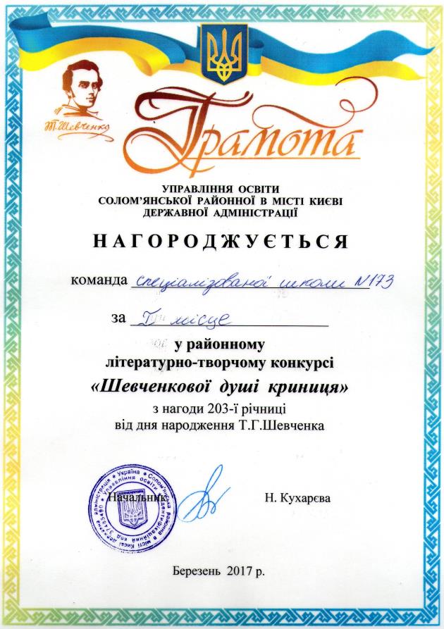 Команда спеціалізованої школи № 173 під керівництвом учителя української мови та літератури Тодосієнко І. Р. здобула 1 місце. Вітаємо!