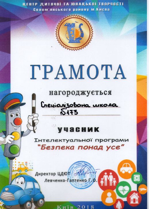 Згуртованість, зібраність у розв'язуванні складних завдань з ПДР дала право відзначити засновникам гри команду спеціалізованої школи № 173 почесною Грамотою.