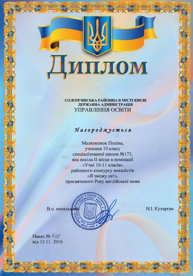 10.11.2016Дипломом ІІ ступеня було нагороджено ученицю 10-Б класу Малюжонок Поліну та її джаз-фанк підтанцьовку у районному конкурсі вокалістів "Я зможу це!" (номінація "Учні 10-11 класів"). Активною учасницею цього пісенного змагання стала учениця 5-А класу Костюченко Валерія.