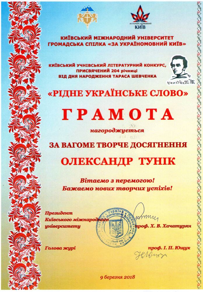Дипломом та грамотами за вагоме творче досягнення нагороджено Скарлат Юлію, 11-Б, Сидоренко Євгенію, 8-Г, Туніка Олександра, 5-Б.
