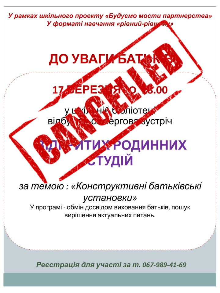 У зв'язку з карантином родинні зустрічі у березні скасовано. Очікуйте нову інформацію.