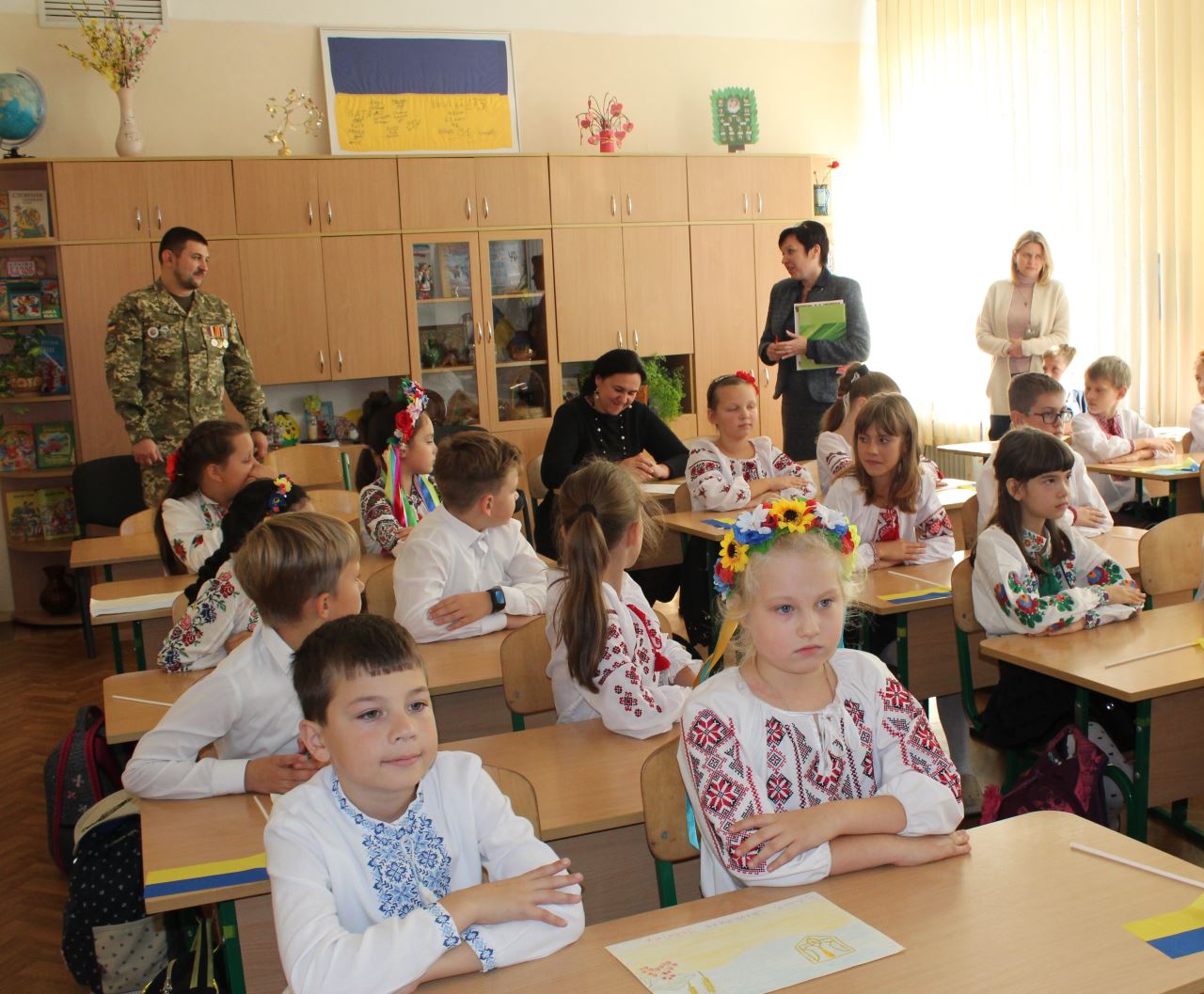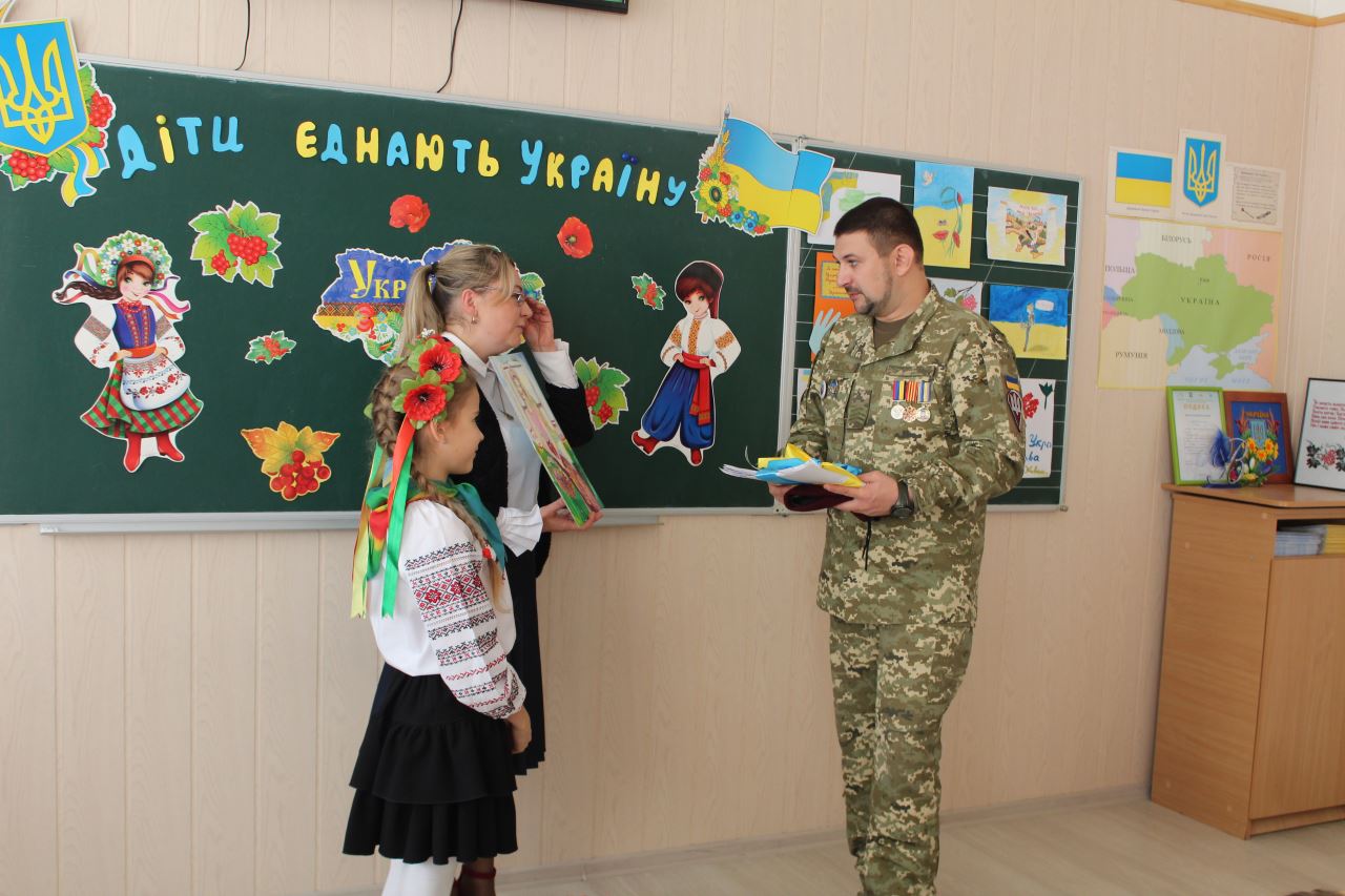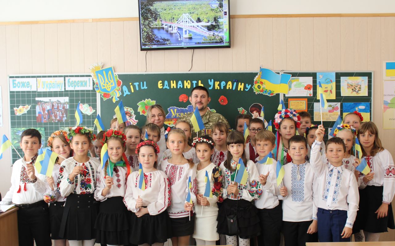 12.10.2018Напередодні Дня українського козацтва та Дня захисника Вітчизни у 4-А класі (класний керівник Дюденко В. В.) відбулося неймовірне патріотичне шоу «Діти єднають Україну». Піднесені зверненням гостя, старшого сержанта 199-ого навчального Центра десантно-штурмових військ, бійця АТО, волонтера, Орлова Сергія Даніїловича, учні співали, декламували вірші, читали молитву, вшанували свічкою пам’яті тих, хто загинув, виборюючи цілісність України. Лідер 4-А класу Лошицька М. попросила Сергія Даніїловича від імені учнів усієї школи привітати бійців АТО та передати їм листівки, виготовлені 5-7 класами. Дюденко В. В. провела церемонію прийняття у школу 173 ще одного члена – Орлова С. Д., прикріпивши йому значок-символ. З повагою учні школи слухали слова директора Мазаєвої Л. А., яка подякувала героєві за мирне небо у рідному краєві.