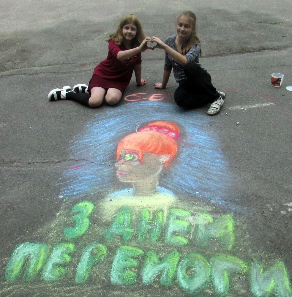 Шкільне самоврядування (керівник – педагог-організатор Толстік К. О.) запропонувало учням 5-7 класів висловити своє ставлення до Дня Перемоги через малюнок на асфальті «Солдатський етюдник».