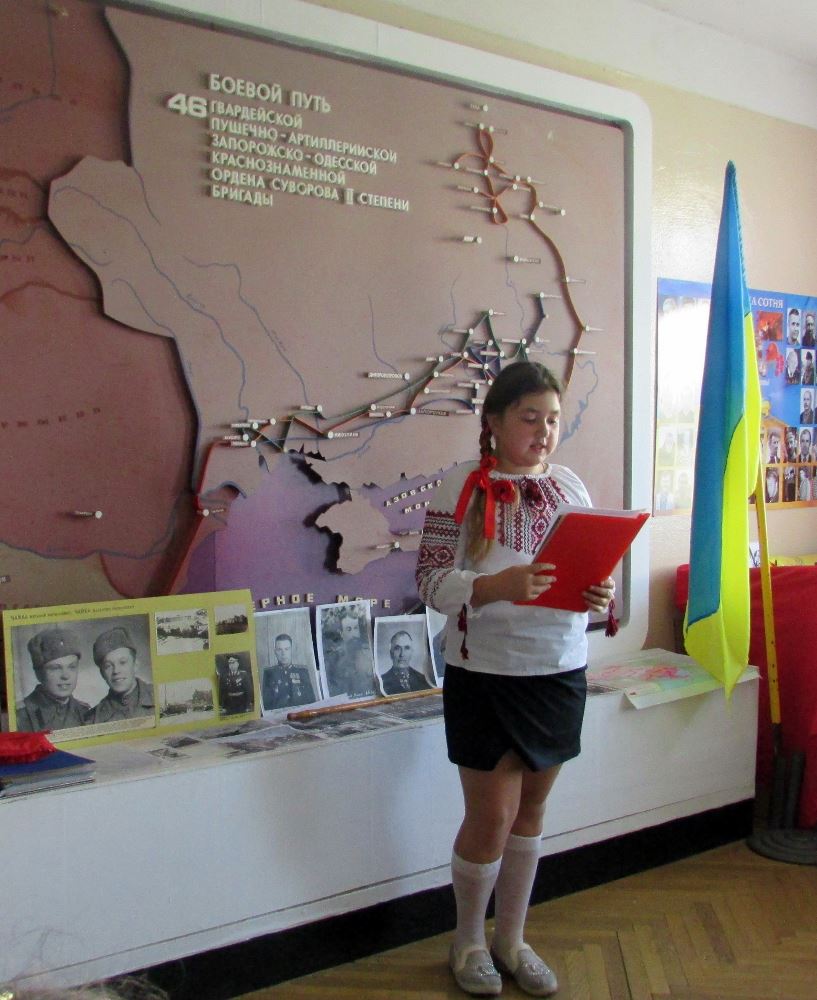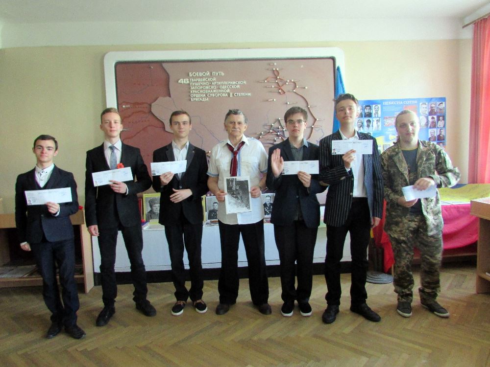Напередодні Дня Перемоги, вшановуючи пам'ять героїв Другої світової війни, у школі відбулися традиційні заходи: уроки мужності «Герої сорокових, порохових», на яких у душевній розмові класними керівниками було відтворено події про ті страшні дні, урок у шкільному музеї «Від Дніпра до Ельби», підготовлений юними екскурсоводами (керівник – учитель історії Піскарьов С. В.), вручення приписних свідоцтв старшокласникам (керівник – учитель «Захисту Вітчизни» Олійник Г. С.), перегляд експозицій Національного військово-історичного музею (2-А, кл.керівник Дехтяренко Е. В., 2-В кл., кл.керівник Гусак Л. О.), покладання квітів до Вічного Вогню.