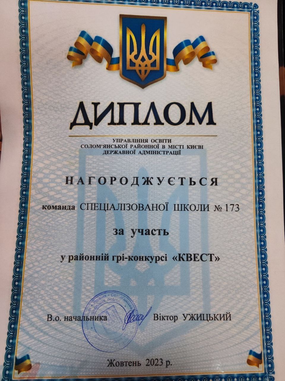 03.11.2023Команда спеціалізованої школи №173 «Соколи» взяла участь у районному квесті «Я люблю Солом’янський район». Команда змагалась з представниками інших шкіл району на спритність, глибину знань про історичні та географічні локації району, креативність, творчі здібності, базові знання з хімії та біології тощо. На кожній із локацій учні також виконували різноманітні цікаві завдання, розгадували ребуси, співали, показували короткі театральні мініатюри на задану тематику.