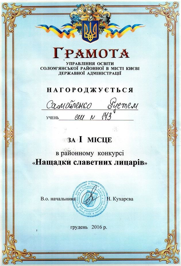 08.12.20166 грудня 2016 року у День Збройних сил України у Солом'янському районі відбувся конкурс "Нащадки славетних лицарів", на якому хлопці-старшокласники виборювали право бути найкращими, наймужнішими, найкреативнішими. Призером цього конкурсу (1 місце) став Самойленко Рустем, учень 10-А класу (кл.кер. Рубанік Т. М.). Вітаємо!