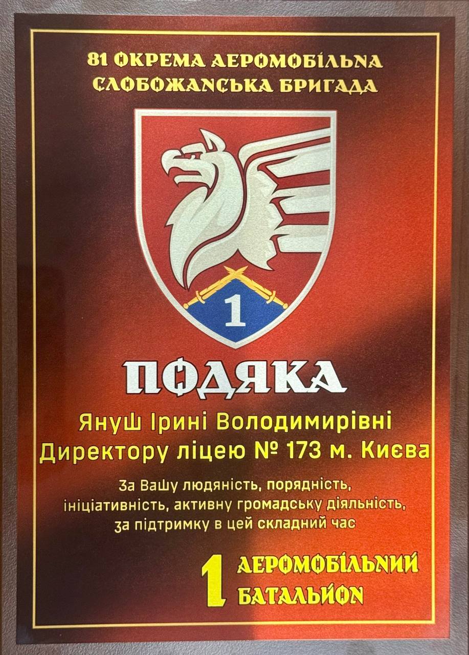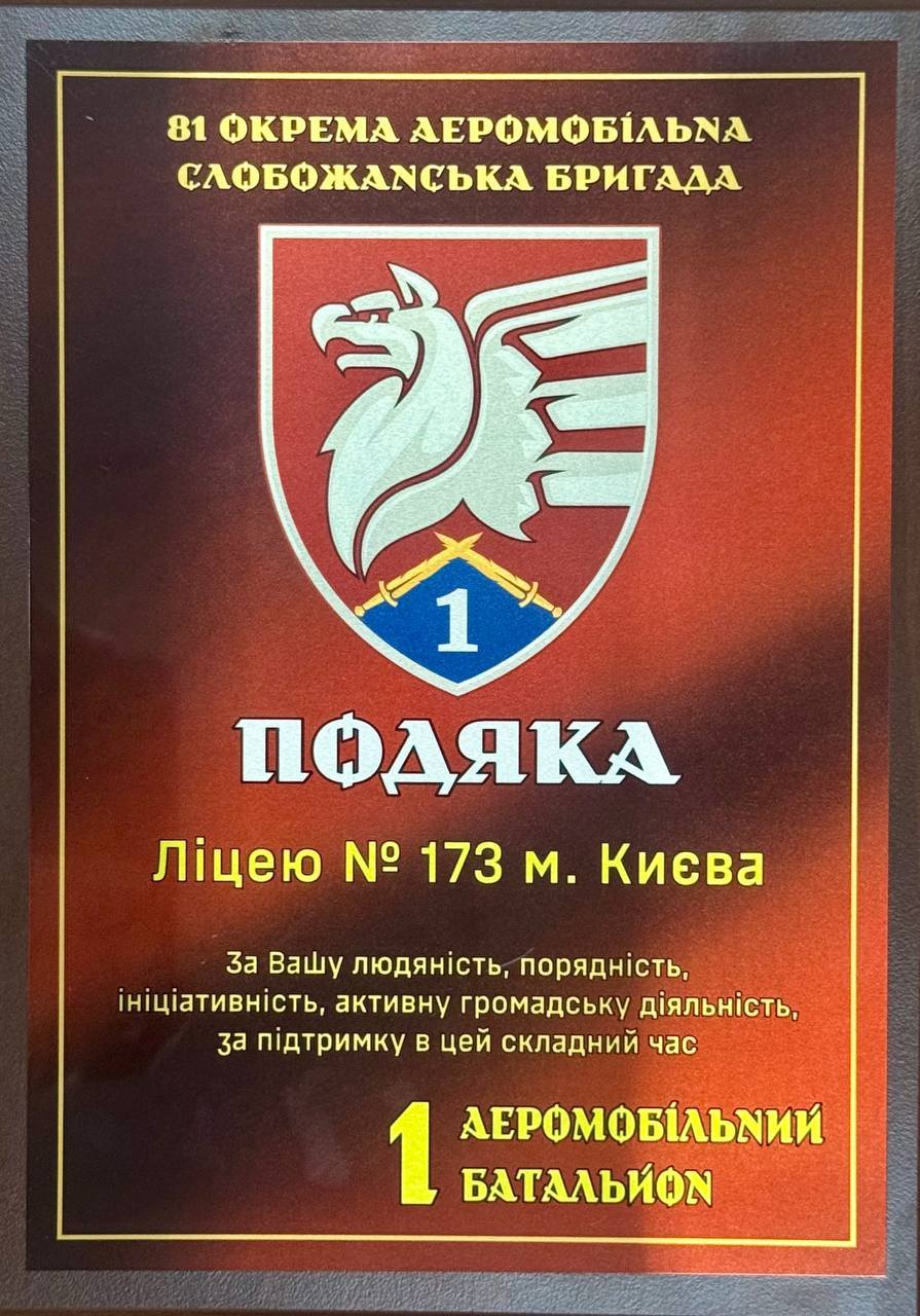 14.11.20255 листопада наш ліцей отримав ПОДЯКУ від 81 окремої аеромобільної бригади 1 аеромобільного батальйону – за підтримку, турботу та допомогу, яку ми разом надали під час благодійного шкільного ярмарку. Цей знак вдячності – не просто документ. Це символ нашої єдності, віри й любові до тих, хто щодня виборює нашу свободу. Дякуємо всім учням, батькам, учителям і друзям Ліцею, які долучилися до збору!