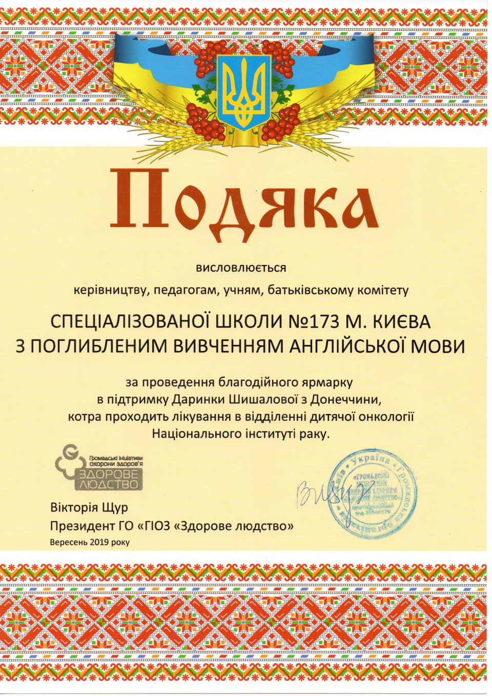05.09.20194 вересня 2019 року відбулася зустріч представників спеціалізованої школи № 173 (лідер ради самоврядування Кучер Тетяна, педагог-організатор Толстік К.О., психолог школи Алісімчик Т.О.), працівника ГО «Здорове людство» та родина Даринки Шишалової (дівчина переживає чергове загострення хвороби) у приміщенні Інституту раку. Там були передані 32370 грн, зібраних шкільною громадою на «Ярмарку ідей». Батько дякував усім небайдужим зі сльозами на очах. Нехай підтримка спеціалізованої школи № 173 стане поштовхом до одужання однорічної крихітки.