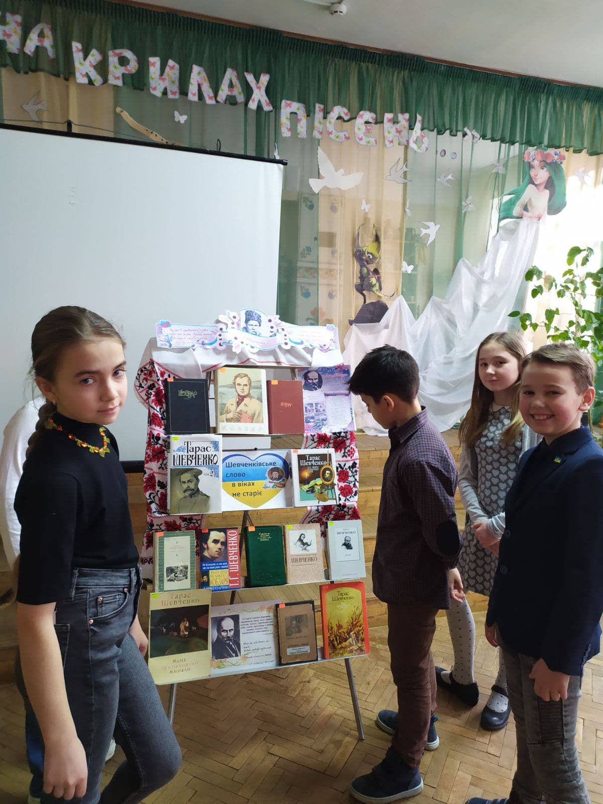У коридорах, вестибюлі та у бібліотеці закладу освіти вчителями української мови та літератури, бібліотекарем Виноградовою Г.О. було організовано виставку стіннівок «Тарас Шевченко – постать крізь століття» для здобувачів освіти закладу, ініційовано проведення соціальної акції з популяризації творчості Кобзаря «#читання_Кобзар» зі зйомкою відеоролика з подальшим його розміщенням у мережі на сторінці «Все буде добре_ОК!». Тематичну експрес-інформацію «Великий співець українського слова» прослухали здобувачі освіти 5-11 класів на уроках української мови та літератури 9-10 березня. На виховних годинах (1-5 класи – очно, 6-11 класи – дистанційно) класні керівники провели у 1-А класі тематичну бесіду «Маленьким про Великого Тараса» (вчитель Дехтяренко Е.В.), у 4-Г класі літературну імпрезу «Ми чуємо тебе, Кобзарю, крізь століття» (вчитель Філоненко В.М.), у 4-6 класах літературний квест «Шлях до Шевченка», у 7-9 класах інтерактивний урок «Тарас Шевченко – син України», у 10-11 класах годину поезії «І лине над землею Шевченкове слово».