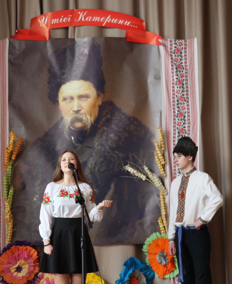Шевченківський тиждень завершився імпрезою «У тієї Катерини …», у якій взяли участь 8-10 класи. На святі учасниками було порушено питання ідеальності жіночого образу у творчості Шевченка. Зі сторінок Шевченкового «Кобзаря» сходять до нас дивовижні жіночі образи, але, на жаль, обездолені. Поет милується красою Причинної, Утопленої, Русалки, Мар’яни-черниці, Ярославни. Жорстокий світ нівечить душі жінок. Чому їхні долі такі трагічні? За умови кріпаччини жінка не може бути щасливою. Твори Кобзаря вчать бути, перш за все, Людиною, яка не бажатиме зла іншому. І, звичайно, кожним рядочком своєї поезії Шевченко закликає: «Люди! Бережіть жінок! Даруйте їм любов і щастя!».