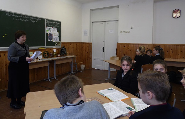 Учитель української мови та літератури Т. Є. Музиченко-Мельник та 5-Б клас.