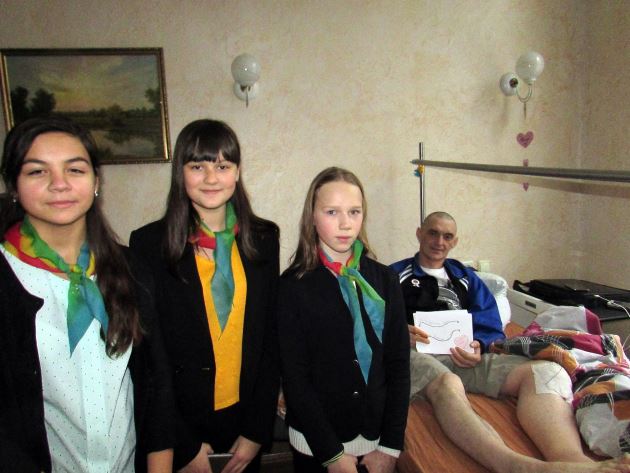 Моральною підтримкою для пораненого у шпиталі виявилися вітальні листівки (з нагоди Дня Збройних сил України), підготовлені напередодні учнями школи.