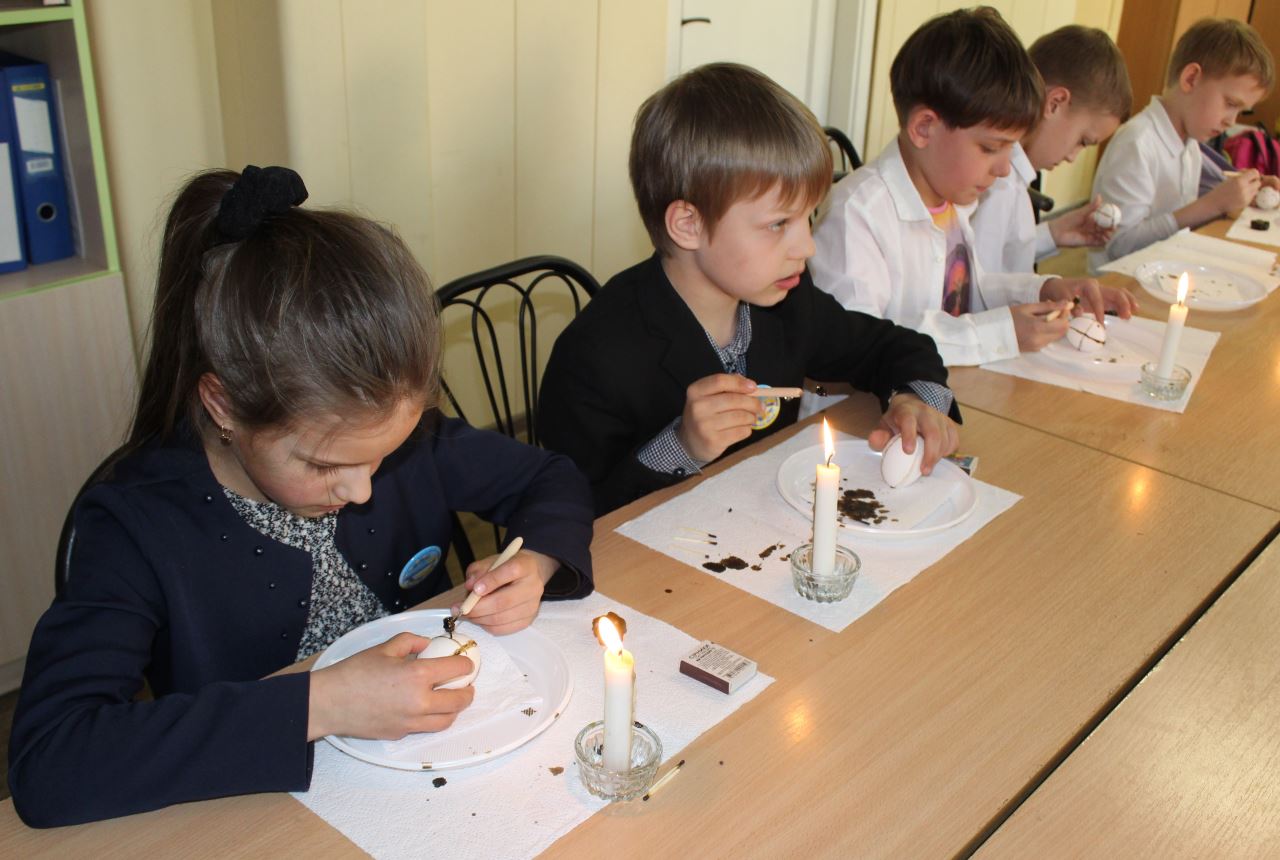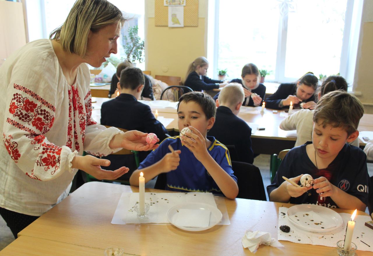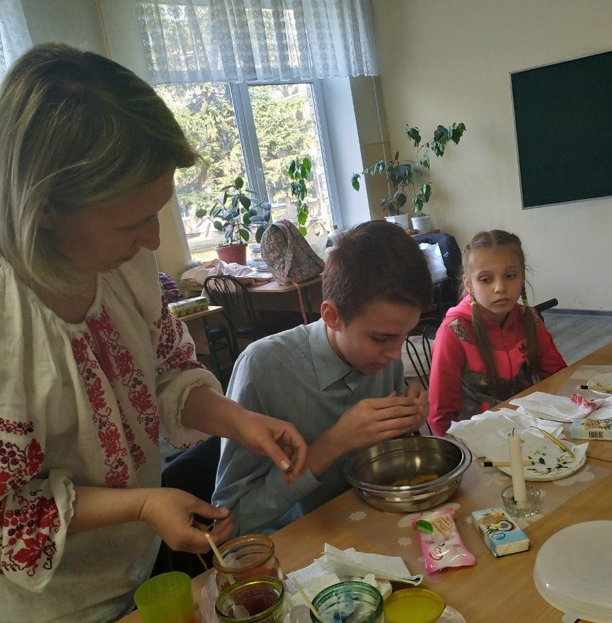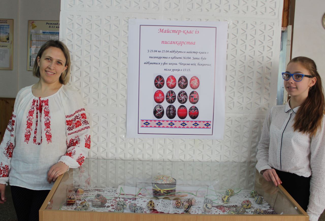 Бажання відвідати майстерню з розпису пасхальних яєць виникає відразу після споглядання виставкових робіт, адже майстриня писачка Кучер Галина організувала міні-виставку своїх робіт у шкільному вестибюлі. Діти радо працюють над виготовленням великоднього символу, а гостинна родина залюбки допомагає юним писанкарям і писанкаркам.