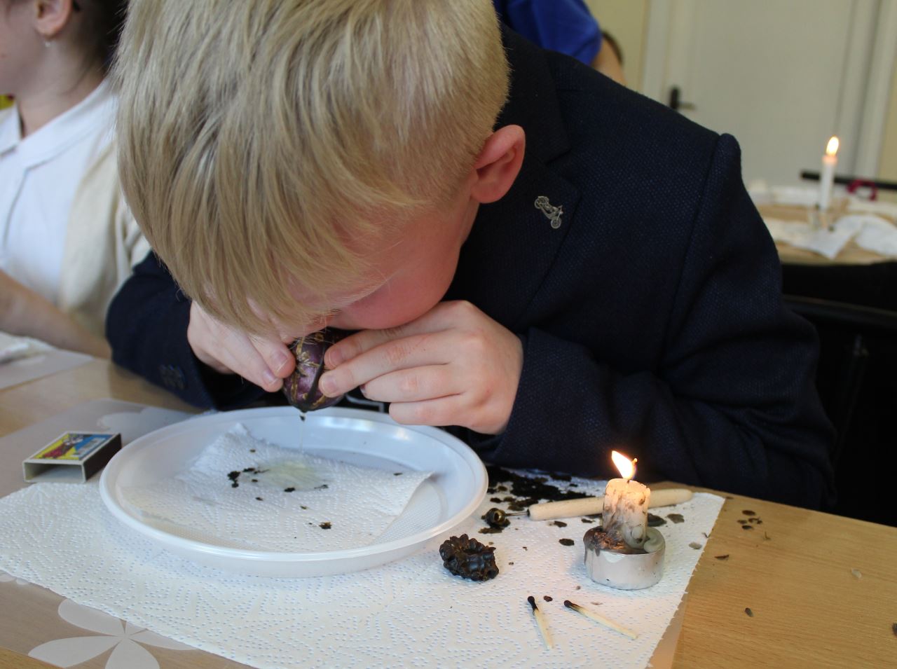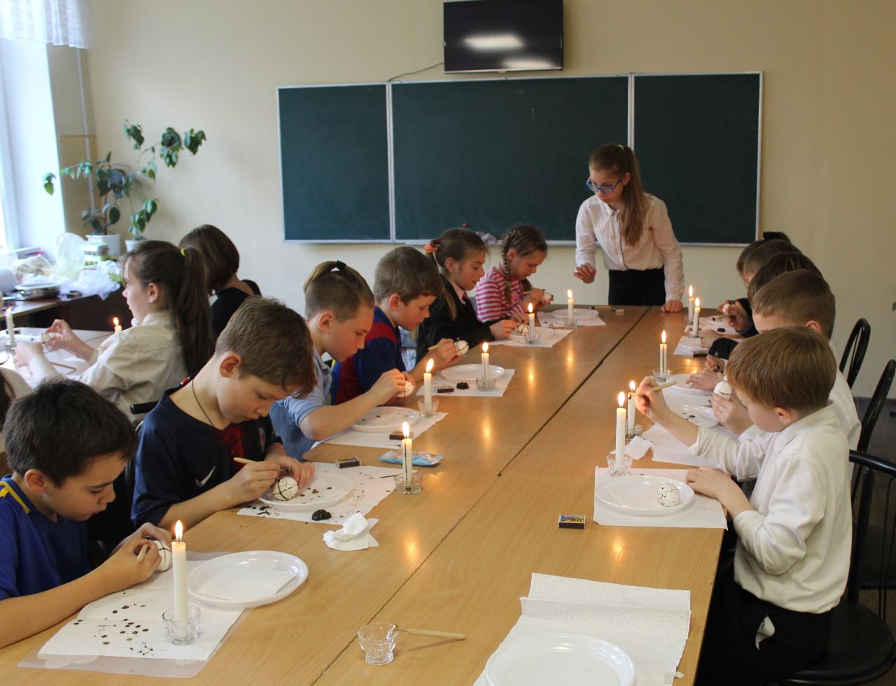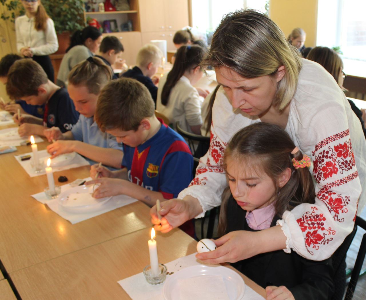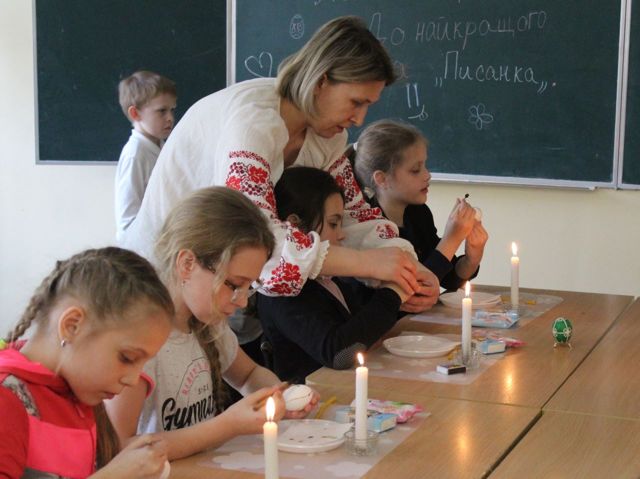 Бажання відвідати майстерню з розпису пасхальних яєць виникає відразу після споглядання виставкових робіт, адже майстриня писачка Кучер Галина організувала міні-виставку своїх робіт у шкільному вестибюлі. Діти радо працюють над виготовленням великоднього символу, а гостинна родина залюбки допомагає юним писанкарям і писанкаркам.