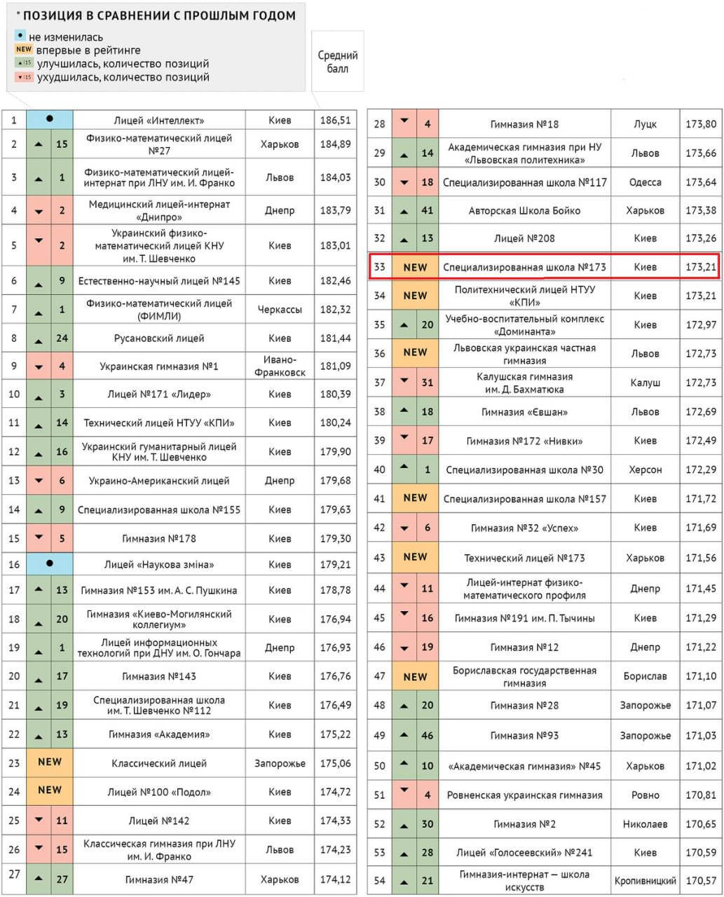 Для усього педагогічного колективу спеціалізованої школи № 173 цей рейтинг став приємною і заслуженою новиною: серед 100 шкіл України 33 позицію посідають випускники-2018, які склали ЗНО на 173,21 бали (середній бал).