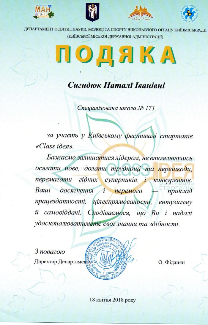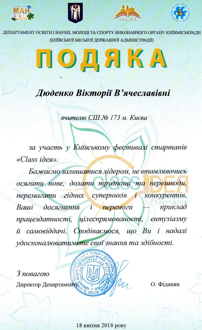 20.04.201818 квітня 2018 року у ККПНЗ «Київський Палац дітей та юнацтва» відбувся Фестиваль стартапів «Сlass ідея» серед здобувачів освіти та педагогічних працівників.