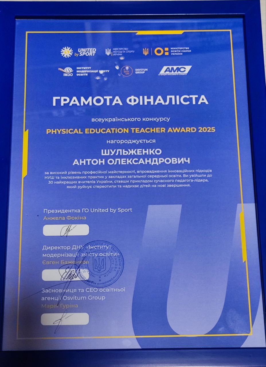 03.04.2026Вітаємо учителя фізичної культури нашого ліцею Шульженка Антона Олександровича, який став фіналістом та отримав відзнаку Всеукраїнського конкурсу Physical Education Teacher Award 2025, ініційованого Громадською організацією «United by Sport» у співпраці з Інститут модернізації змісту освіти в межах програми «Нова фізична культура».