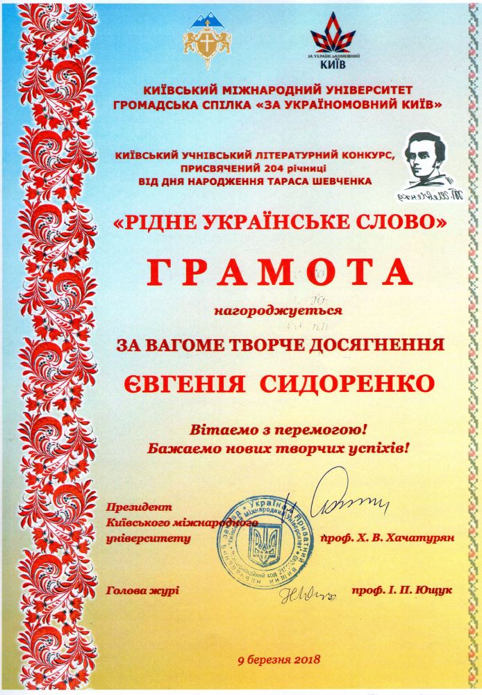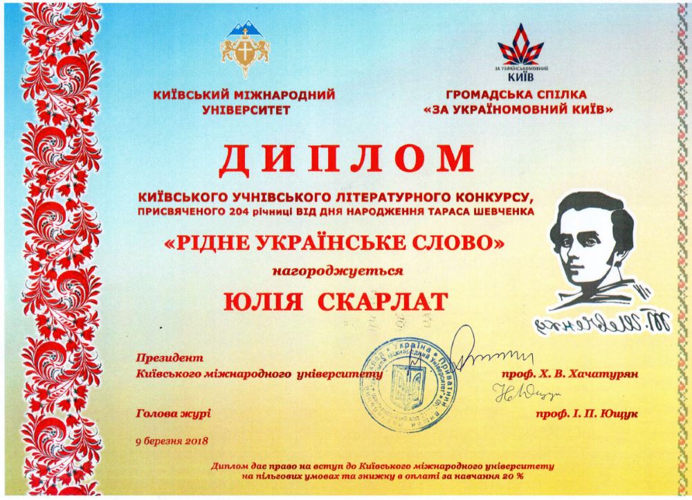 Дипломом та грамотами за вагоме творче досягнення нагороджено Скарлат Юлію, 11-Б, Сидоренко Євгенію, 8-Г, Туніка Олександра, 5-Б.