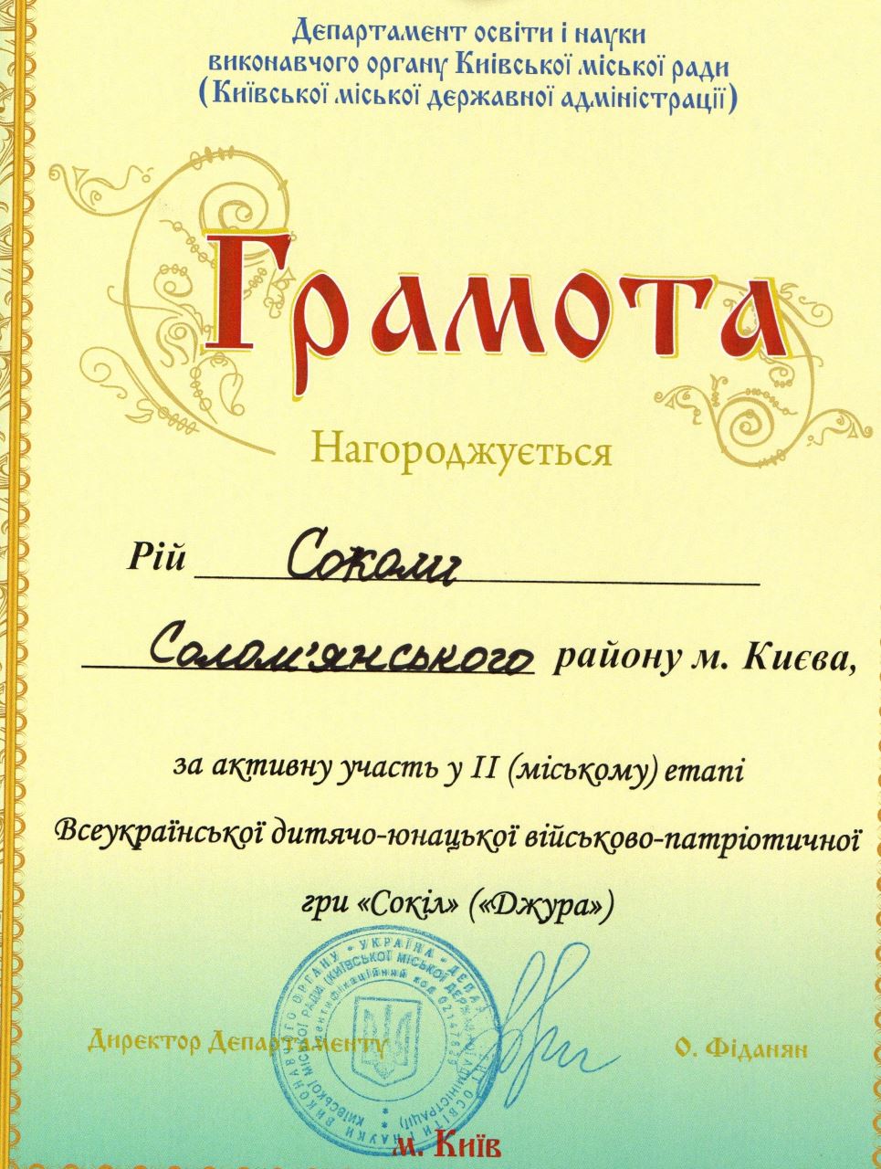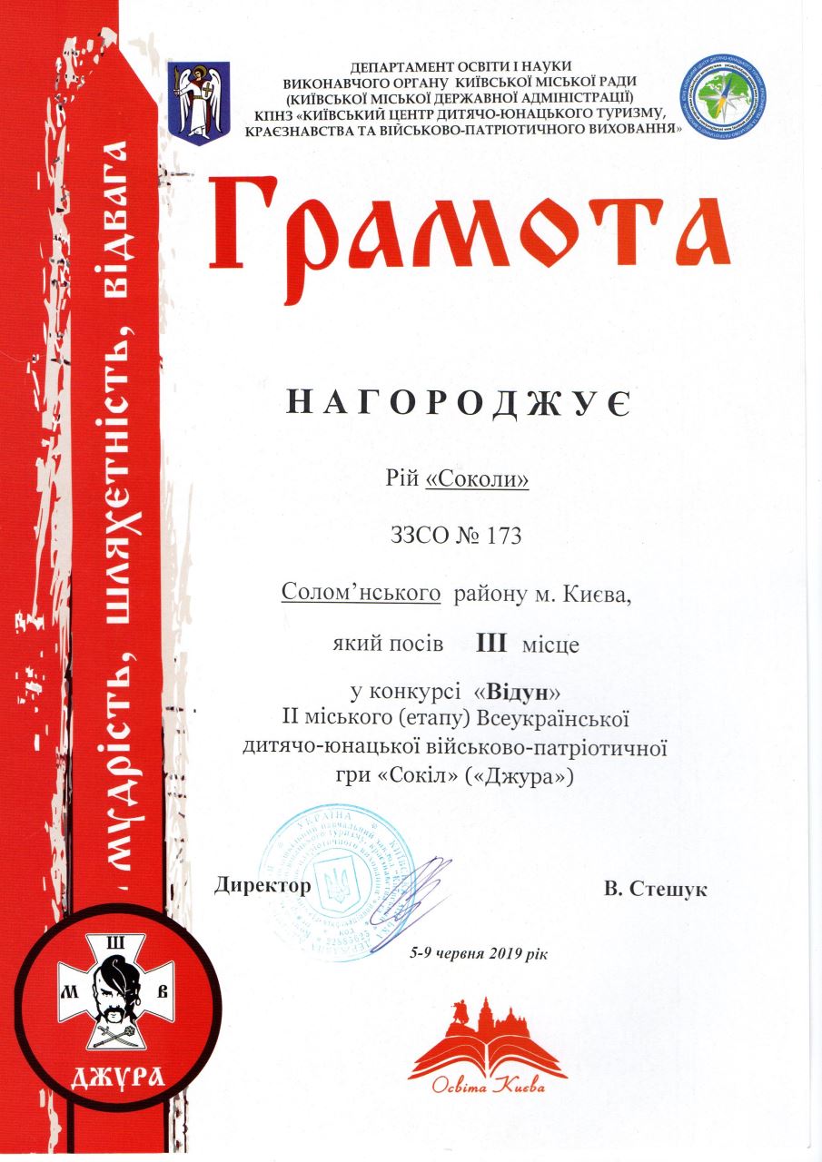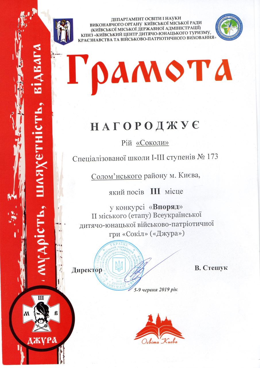 10.06.2019За козацьких часів українському народові були приманні високий рівень шляхетності, моральності, духовності, доблесті, звитяги, знання, бездоганне дотримання православних традицій і звичаїв. Ці якості потрібні українському народові й сьогодні. У підростаючого покоління необхідно виховувати глибокі почуття патріотизму та національної гідності, справжніх якостей захисника Вітчизни, високий рівень загальної культури та народознавства, народної етики, моралі, культури. Виконанню цих завдань сприяє дитячо-юнацька військово-спортивна патріотична гра «Сокіл» («Джура»). У рамках реалізації цього проекту в спеціалізованій школі № 173 з 2013-2014 навчального утворено козацький рій «Соколи», який діє під гаслом: «Соколи» ми нездоланні, цілі бездоганні. Ми старанні в тренуванні, переможемо в змаганні». Незмінними виховниками шкільних джур є Павленко Олена Геннадіївна та Шульженко Антон Олександрович.