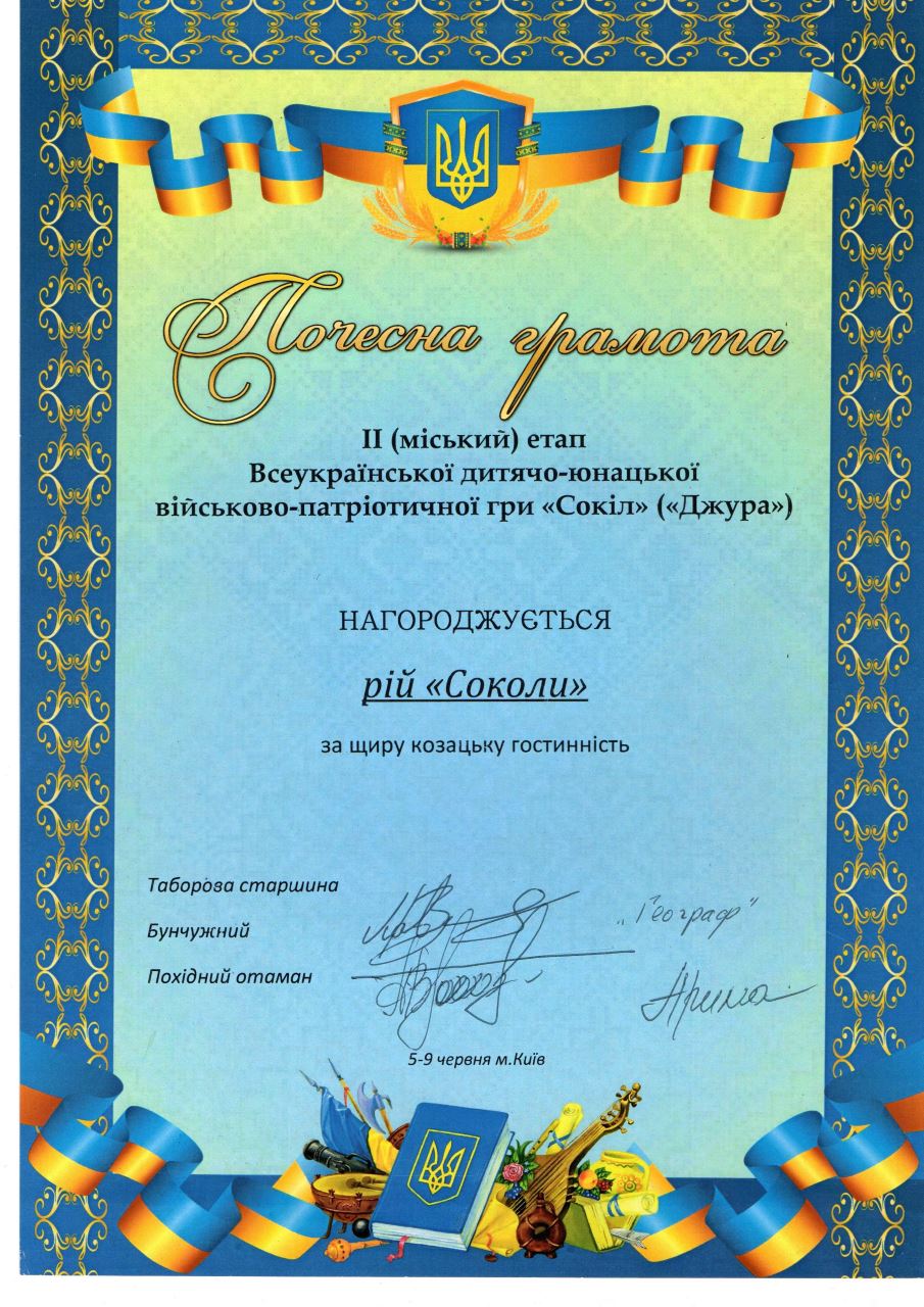 Рій нагороджено двома кубками за призові місця в інтелектуальній вікторині «Відун» та конкурсі строю та пісні «Впоряд». У загальному заліку «Соколи» посіли 6 місце серед десяти команд-переможців районного етапу гри. На урочистому закриті були відзначені Грамотою Департаменту освіти. Вітаємо!