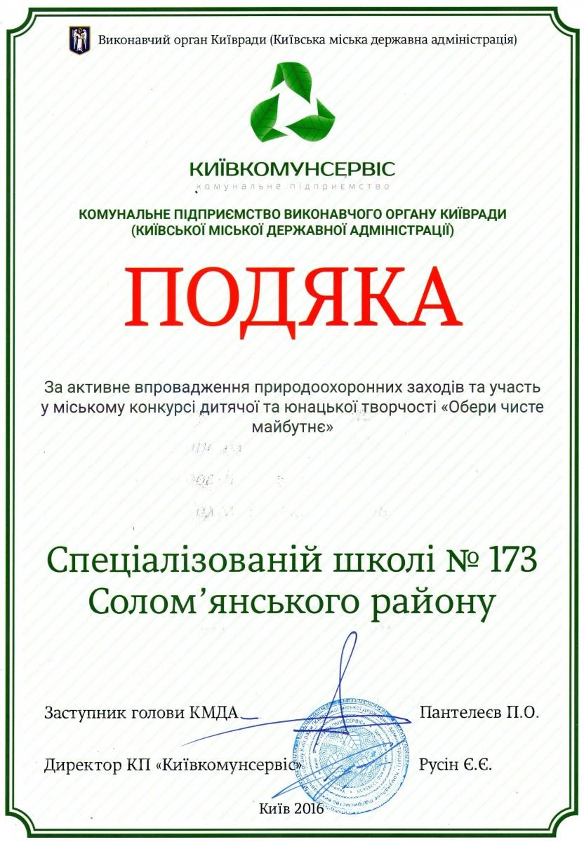 07.11.2016Подякою Київкомунсервіс нагороджено колектив сш №173 за участь у міському конкурсі «Обери чисте майбутнє». Творчі роботи підготували Баранова Яна, 8-Б, Капля Андрій, 8-Б, Кондратов Олександр, 8-Б, Зінченко Анастасія, 7-В, Малецька Софія, 8-А, Арентова Марія, 10-Б, під керівництвом учителя ОТМ Пилипенко Л. В. та учителя трудового навчання Воловиченко Г. А.