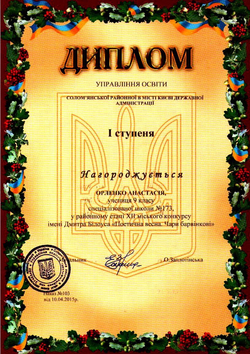 07.05.2015Вітаємо Анастасію Орленко, ученицю 9-А класу, з першим місцем на районному етапі ХІІ конкурсу імені Дмитра Білоуса "Поетична весна. Чари барвінкові"