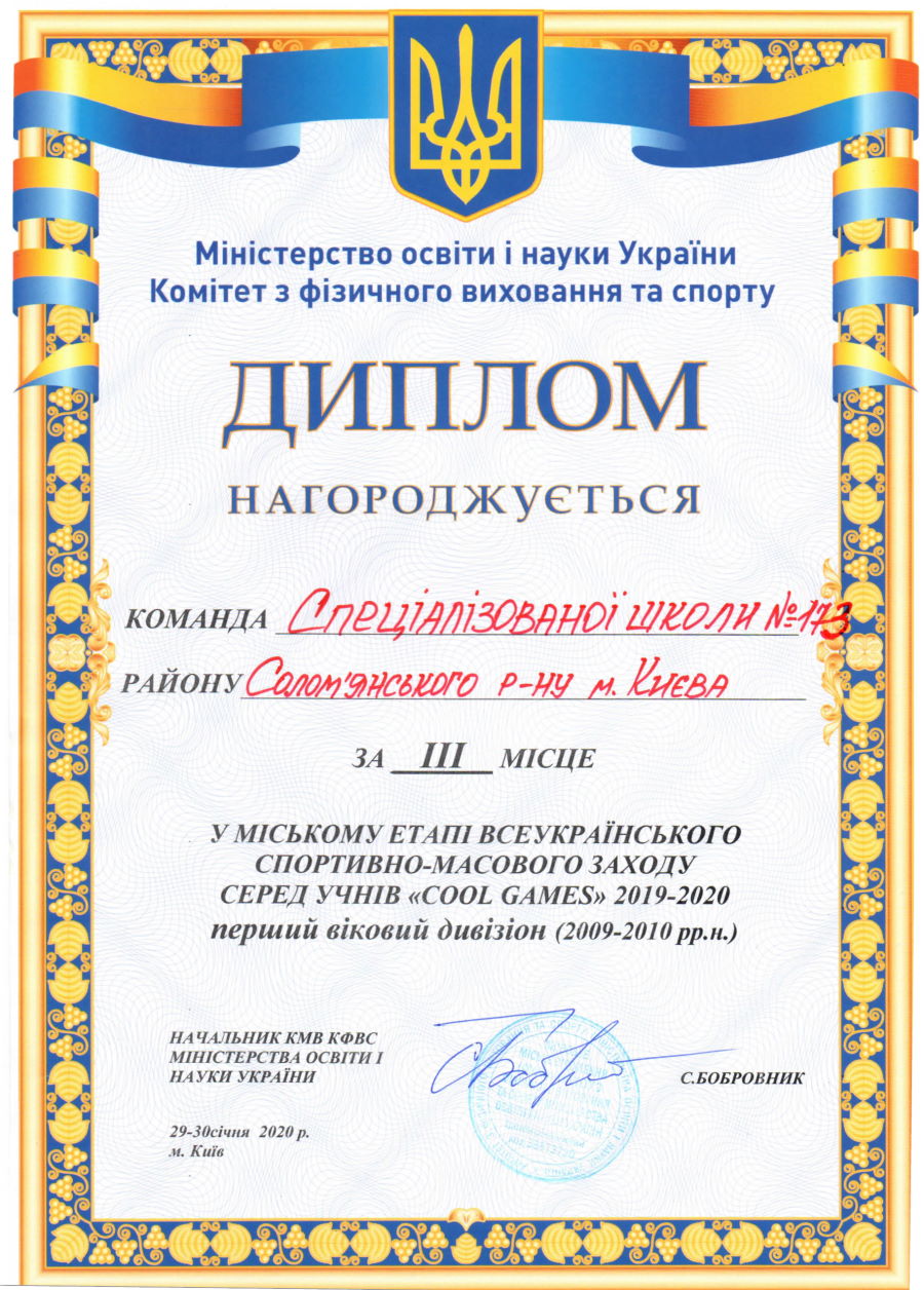 31.01.2020Призерами (ІІІ місце) міського етапу Всеукраїнського спортивно-масового заходу «Cool Games» стала команда учнів молодшого віку спеціалізованої школи № 173 (Аверіна Дар’я, Бутко Катерина, Варченко Нікіта, Головень Руслан, Зінченко Володимир, Кондратюк Ірина, Кошик Яна, Опанасюк Артем) під керівництвом учителів фізичного виховання павленко О.Г., Шульженко А.О. та педагога-організатора Толстік К.О. Змагання відбувалися 29.01.2020 року на спортивній базі НВК «Домінанта» Дніпровського району. Вітаємо!