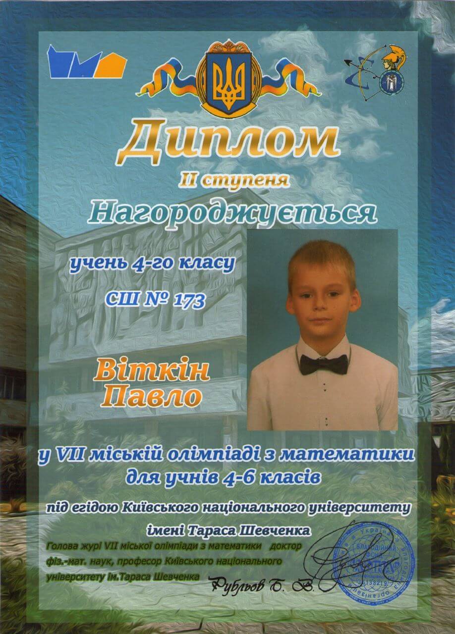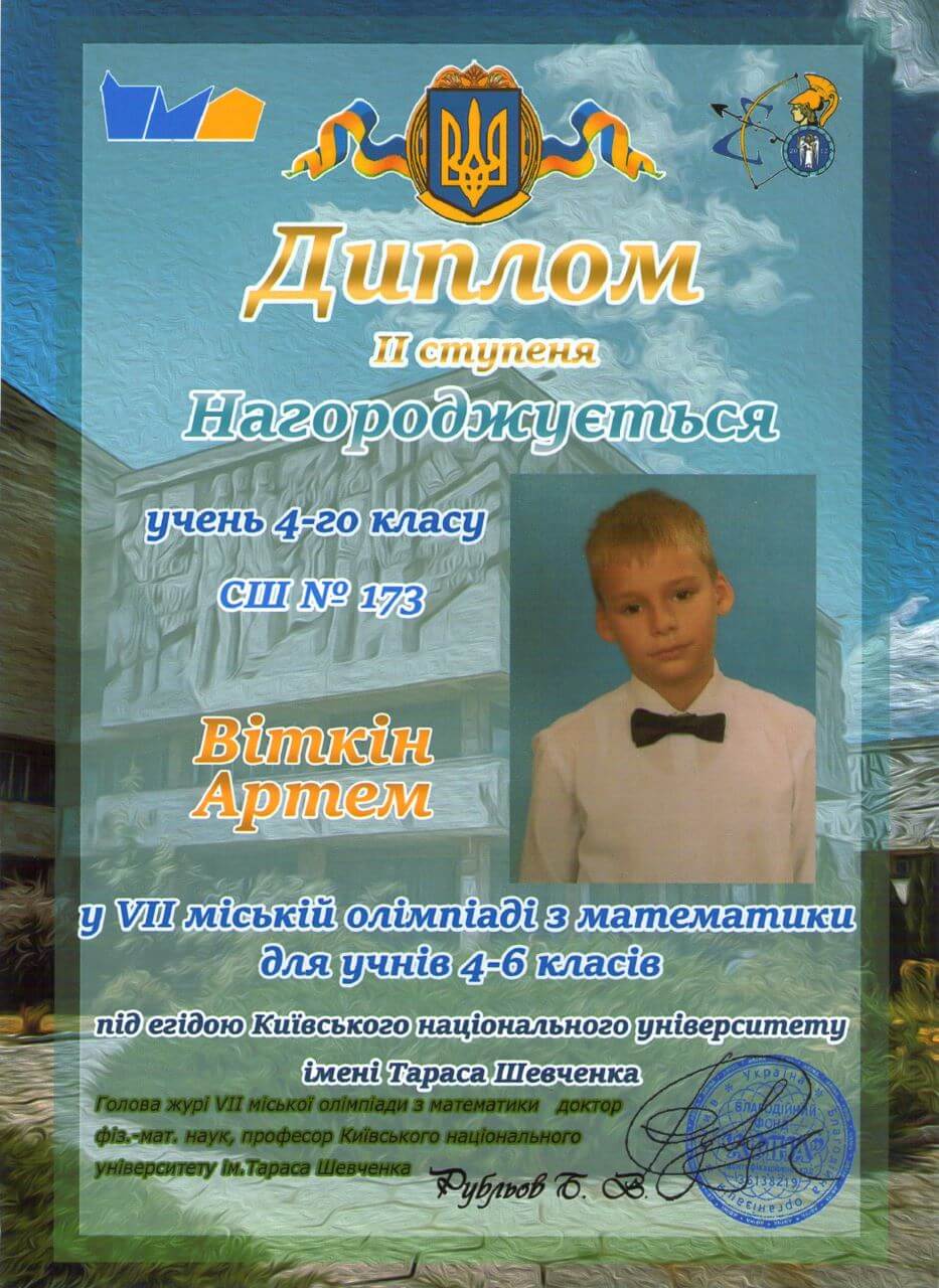Вітаємо учнів 4-Б класу Віткіних Павла та Артема з перемогою у VII міській олімпіаді з математики, яка відбулася за ініціативи КНУ ім. Т.Г. Шевченка.