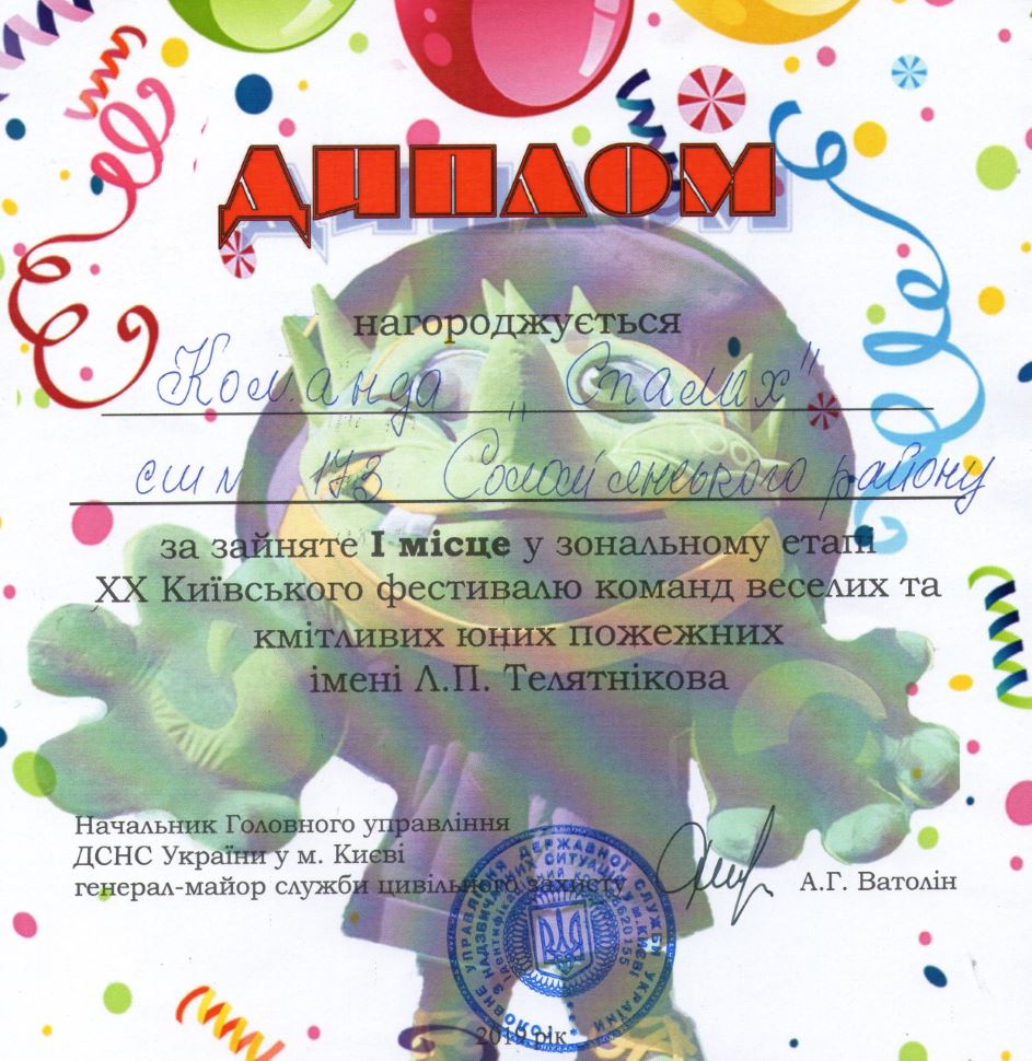 17.04.2019Команда «Спалах» (10-А клас, класний керівник – Арентова Н. С.) посіла І місце у зональному етапі ХХ Київського фестивалю команд веселих та кмітливих юних пожежних імені Л. П. Телятнікова. Юні вогнеборці 19 травня у Маріїнському парку захищатимуть своє вміння серед команд України. Вітаємо!