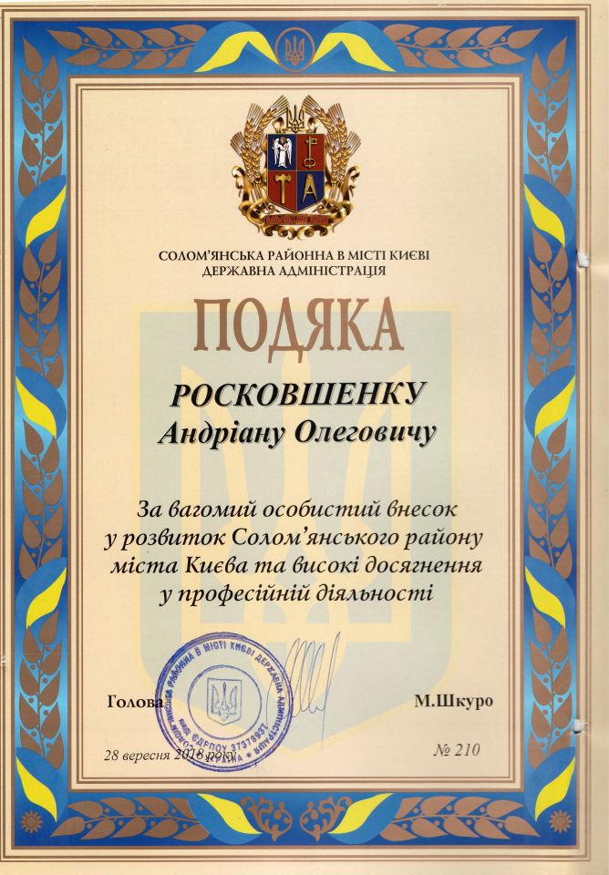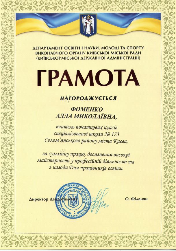 З нагоди Дня працівника освіти та за сумлінну працю керівництво Солом’янського району відзначило грамотою й подякою педагогічну майстерність учителя початкових класів Фоменко А. М. та учителя інформатики Росковшенко А. О.